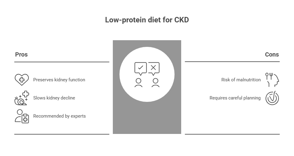 For patients with chronic kidney disease who are not on dialysis, eating too much protein can be harmful. Excess protein puts additional strain on the kidneys, accelerating their decline. That is why nephrologists and dietitians often recommend a controlled, low-protein diet for CKD patients. This helps preserve kidney function for as long as possible.