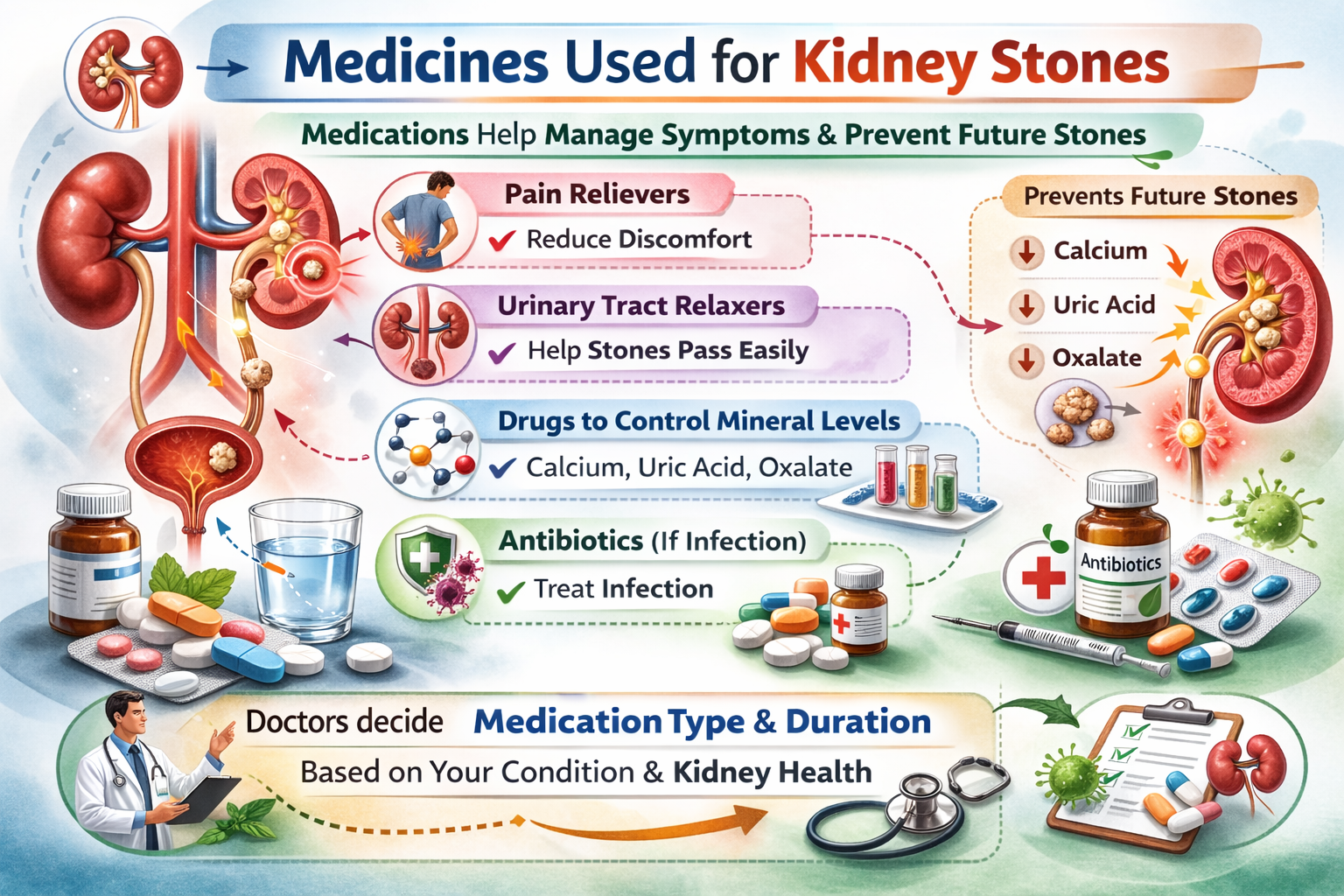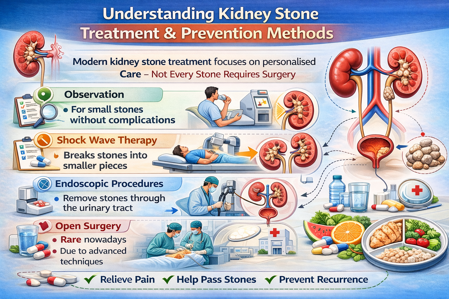 Kidney stones can cause severe pain, but effective treatments are available. From medicines to advanced procedures, treatment focuses on relief and protecting kidney health. Prevention mainly depends on simple daily habits like staying hydrated, eating a balanced diet, and regular medical check-ups.