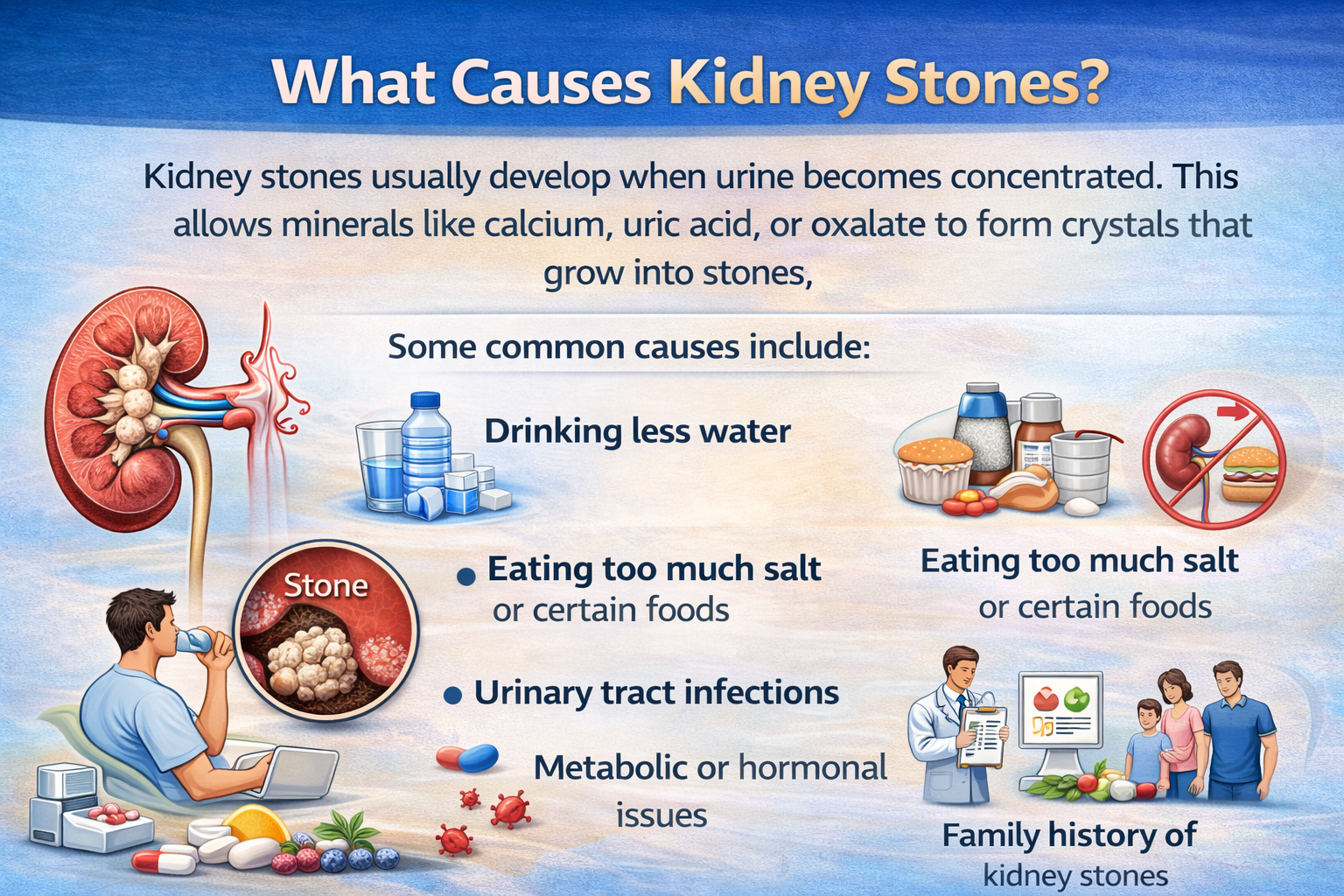 Some people get stones only once, while others may experience them repeatedly. Dehydration, high calcium in urine, or certain health conditions can increase the risk. Stones can stay silent for years, but when they move, they often cause severe pain.