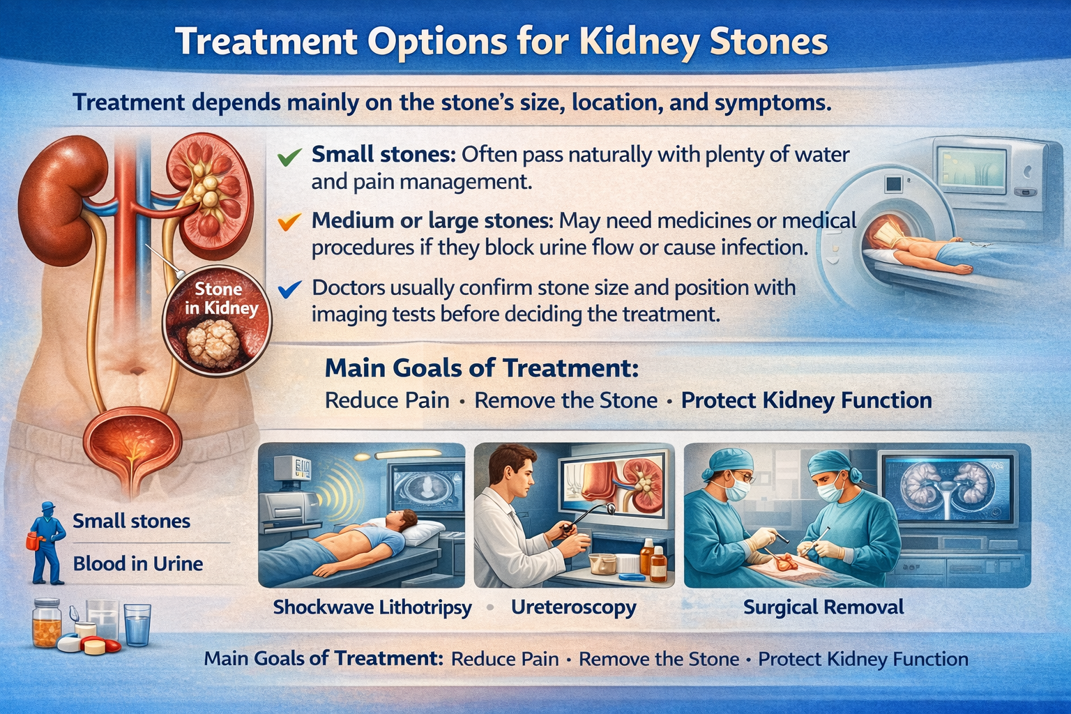 The main goals of treatment are simple — reduce pain, remove the stone, and protect kidney function.